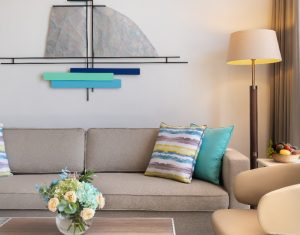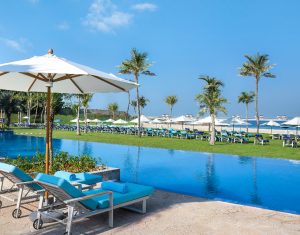 Nestled amongst lavish manicured gardens with trickling water features and quivering peacocks, the low-rise whitewashed buildings that make up the 5-star JA Palm Tree Court have a relaxed air reminiscent of the Mediterranean. Exuding mindful luxury on the palm-scattered fringes of an 800-metre private beach, this 5-star resort’s suites all come with the benefit of blissful sea views. Outdoors, four swimming pools with swim-up bars and a bio-garden await, filled with aromatic herbs and vegetables served up in the hotel’s all-encompassing restaurants. Delightfully family-friendly, the hotel offers much to entertain young and old, from falcon shows and a 9-hole golf course to banana boat rides and equestrian swims.