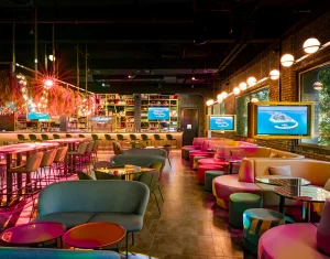 Six 40” plasma TVs and high-speed Wi-Fi connection.