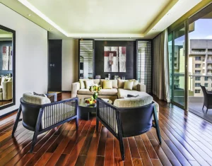 80 – 90 sqm with 1 bedroom, king bed, ottoman and a walk-in closet.