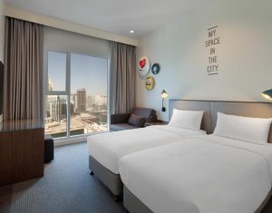 Rove Dubai Marina is a contemporary hotel situated in the heart of Dubai Marina, offering guests a blend of comfort, convenience, and vibrant surroundings. Guests can enjoy a range of amenities, including an outdoor swimming pool, a 24-hour gym, self-service laundromat, and a convenience store. The on-site restaurant, The Daily, serves a variety of international dishes throughout the day. The hotel’s prime location provides easy access to popular attractions such as JBR Beach, Dubai Marina Mall, and The Walk, all within walking distance. Additionally, the hotel offers a complimentary shuttle service to nearby destinations, enhancing its appeal to both business and leisure travelers. With its modern design, practical amenities, and strategic location, Rove Dubai Marina serves as an excellent base for exploring the dynamic city of Dubai.